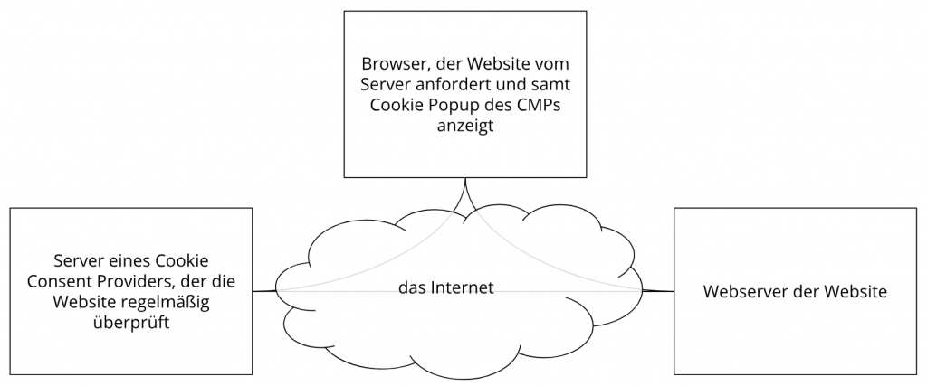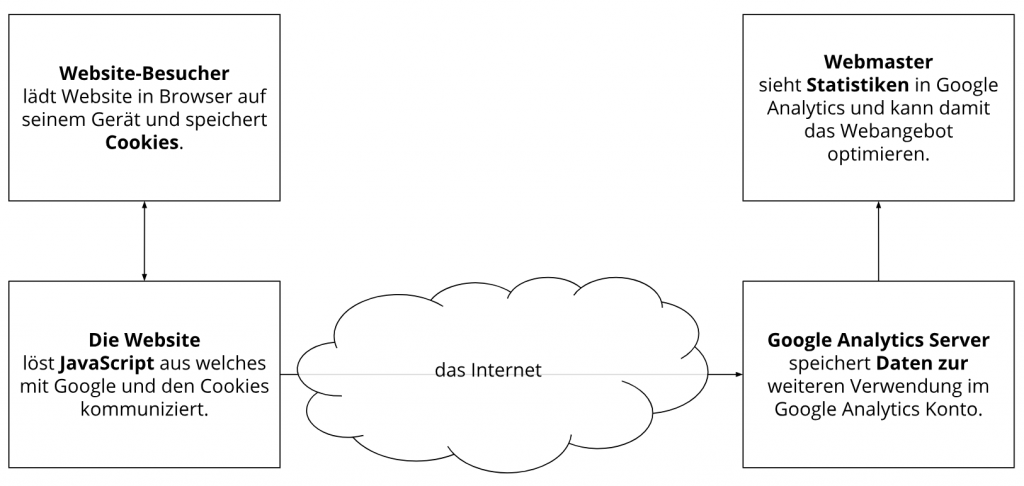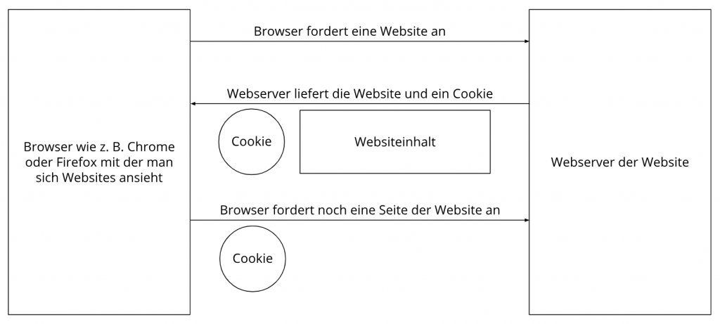 Die folgende Grafik zeigt eine mögliche Interaktion zwischen einem Webbrowser wie z. B. Chrome und dem Webserver. Dabei fordert der Webbrowser eine Website an und erhält vom Server ein Cookie zurück, welches der Browser erneut verwendet, sobald eine andere Seite angefordert wird.
