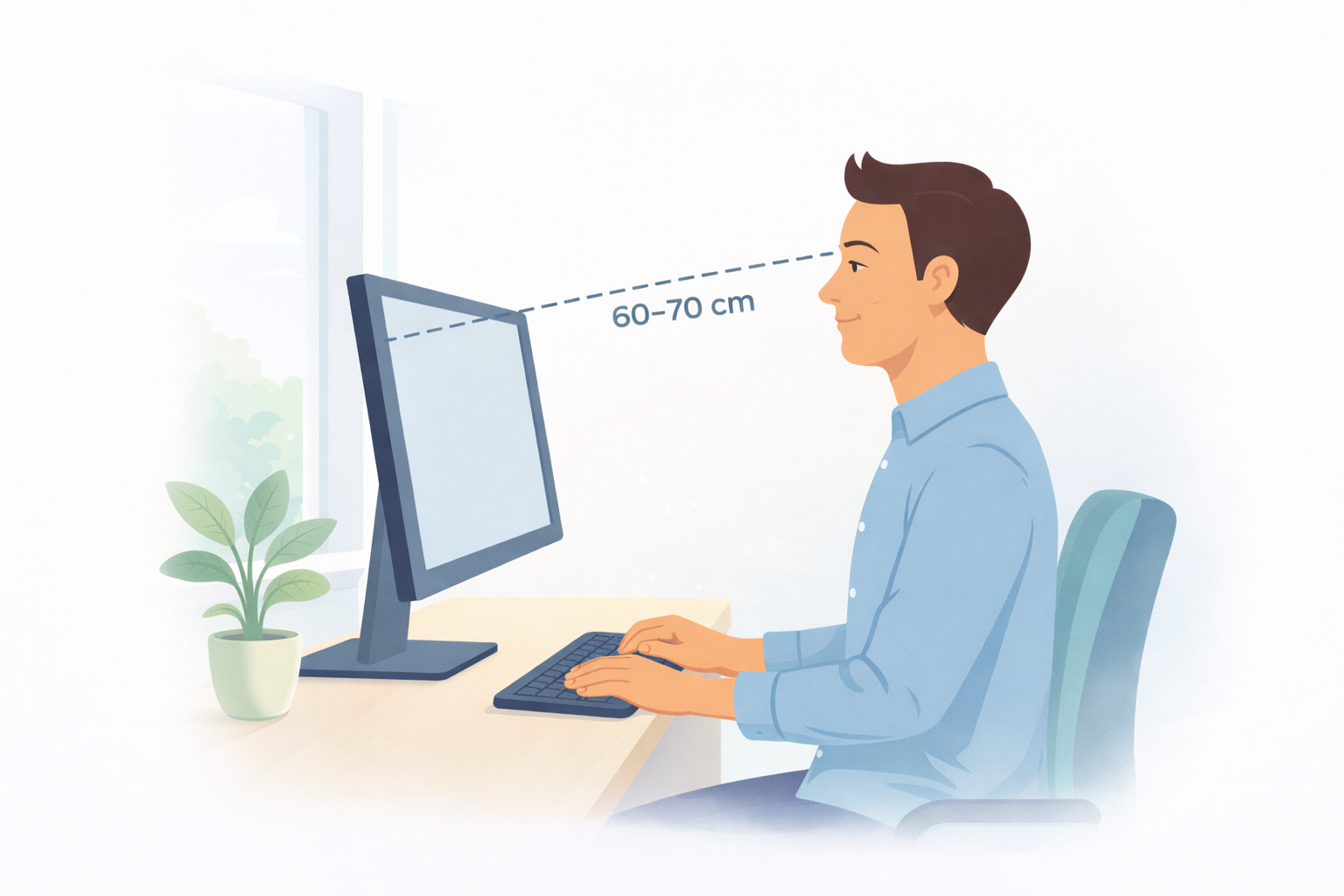 Abstand 60–70 cm, Oberkante des Monitors leicht unter Augenhöhe, Blick leicht nach unten; Bildschirm seitlich zum Fenster, keine Blendungen.