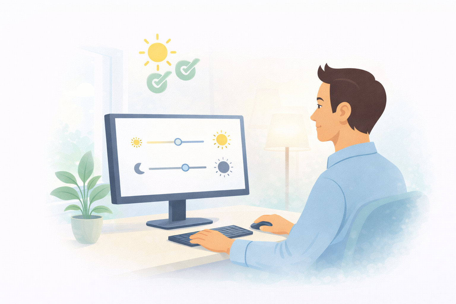 Bildschirmhelligkeit und Kontrast an die Umgebungsbeleuchtung angleichen, Spiegelungen vermeiden, indirektes Licht nutzen. Zu grell oder zu dunkel überanstrengt die Augen.